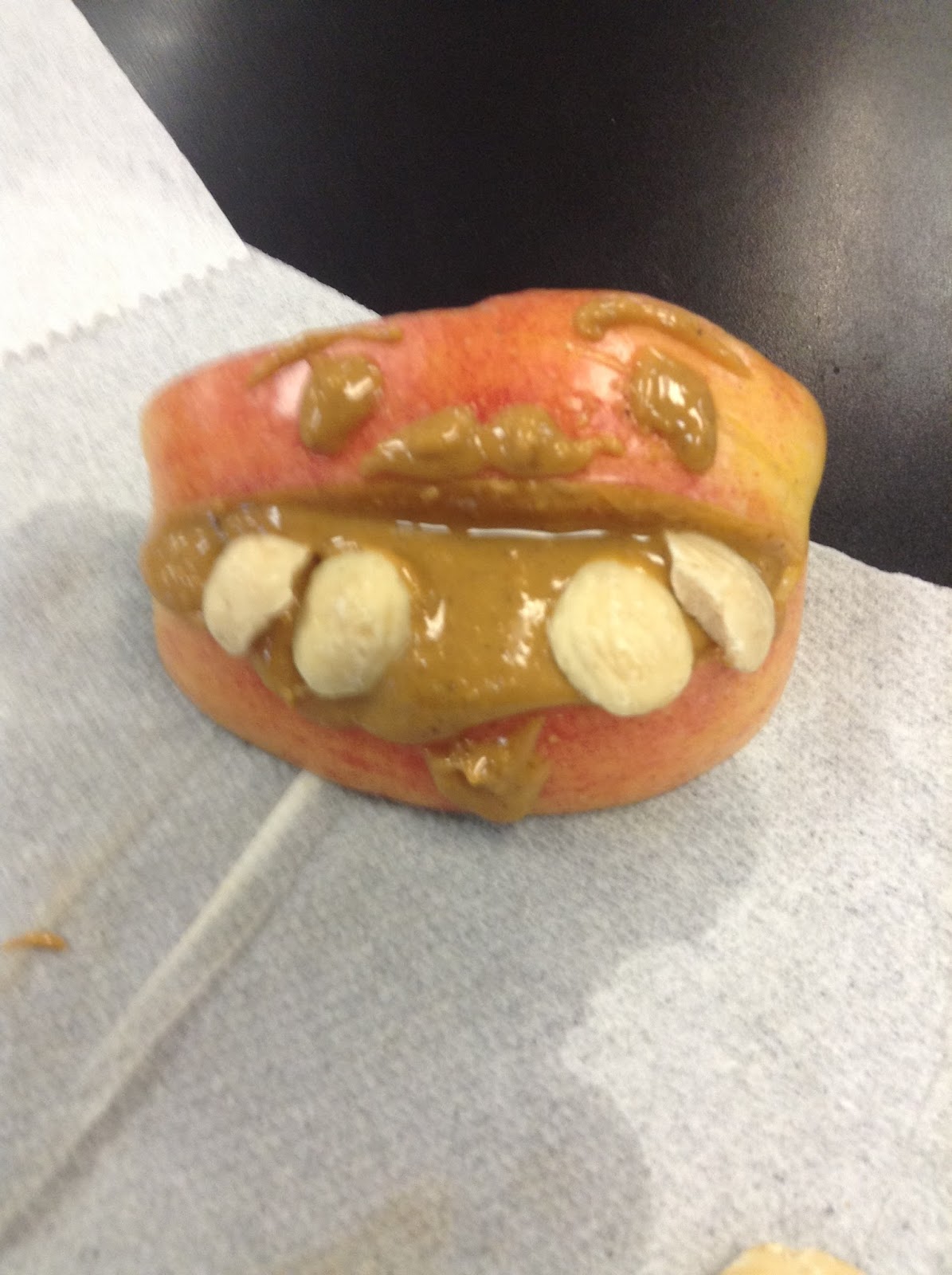 We made very cute and healthy snacks for Alexandria's and Simrun's Monday Wellness. We learned about what makes a healthy snack too. You should snack 2-3 times a day a couple hours before a meal and should eat nutrient rich snacks, not empty snacks that are high calorie and sugar.You should definitely stay away from super sweet and sticky snacks like artificial granola bars. Making the little apple snacks was really fun and were very yummy. The only thing is the apple got stuck in my braces but that has nothing to do with the activity.